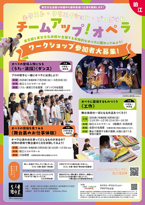 東京都と公益財団法人東京都歴史文化財団が実施する子供向け芸術文化体験プログラムです。子供たちがより深く、より高いレベルで学ぶことができるよう、自らが興味関心を持つクリエイションの現場に入り、各分野の第一線で活躍するプロフェッショナルから指導を受けることができます。子供たちの芸術文化への夢や個性に寄り添いながら豊かな才能の開花を後押しすることを目指しています。