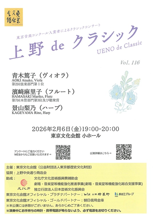 上野 de クラシック Vol.116 青木篤子(ヴィオラ)・濱﨑麻里子(フルート)・景山梨乃(ハープ)